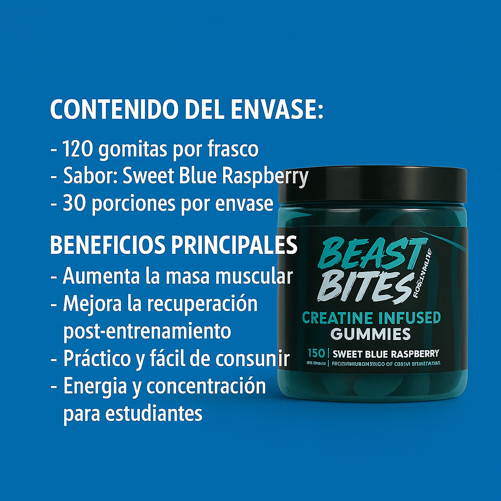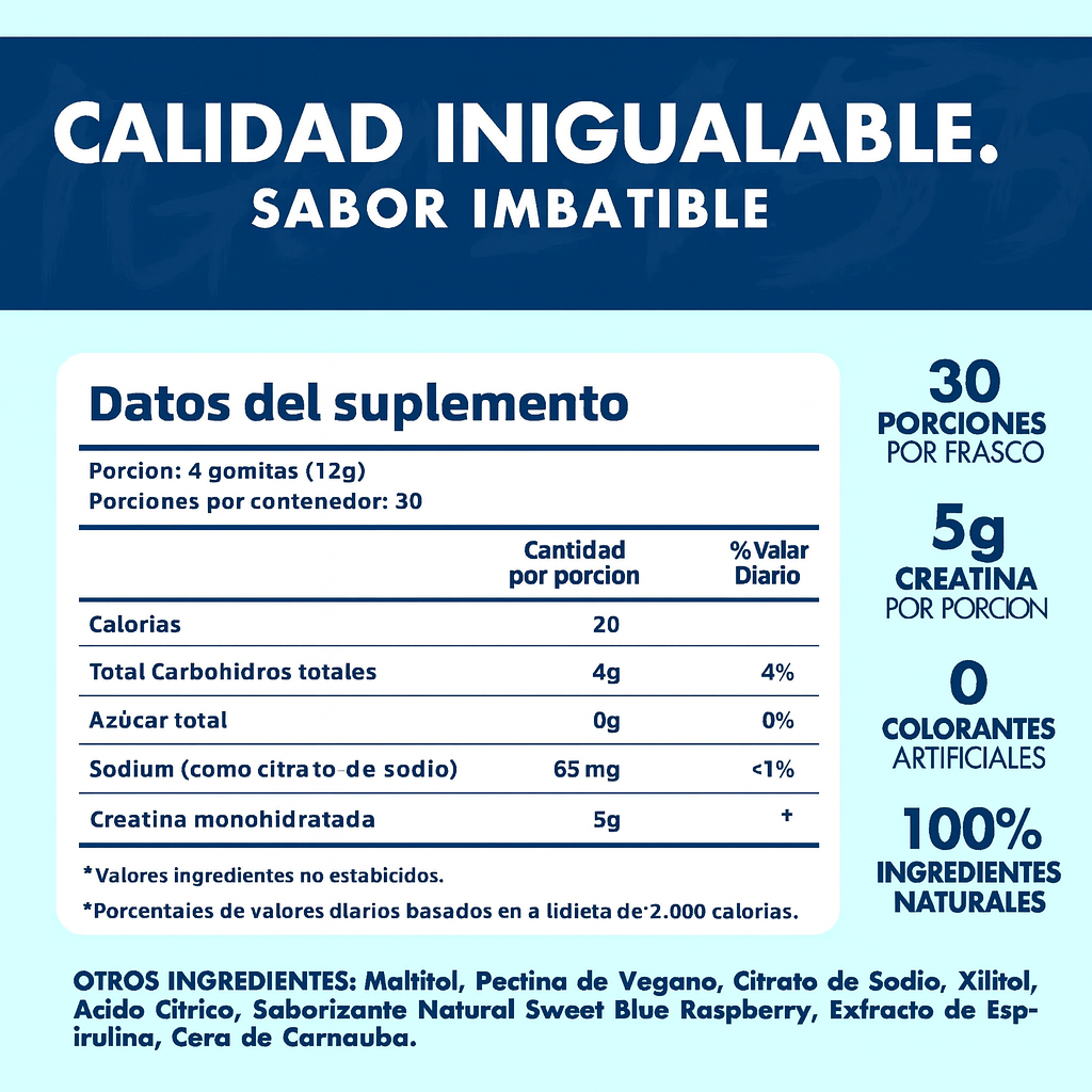Toma de 2 a 4 gomitas al día, preferiblemente antes del entrenamiento o en momentos de alta demanda física o mental.